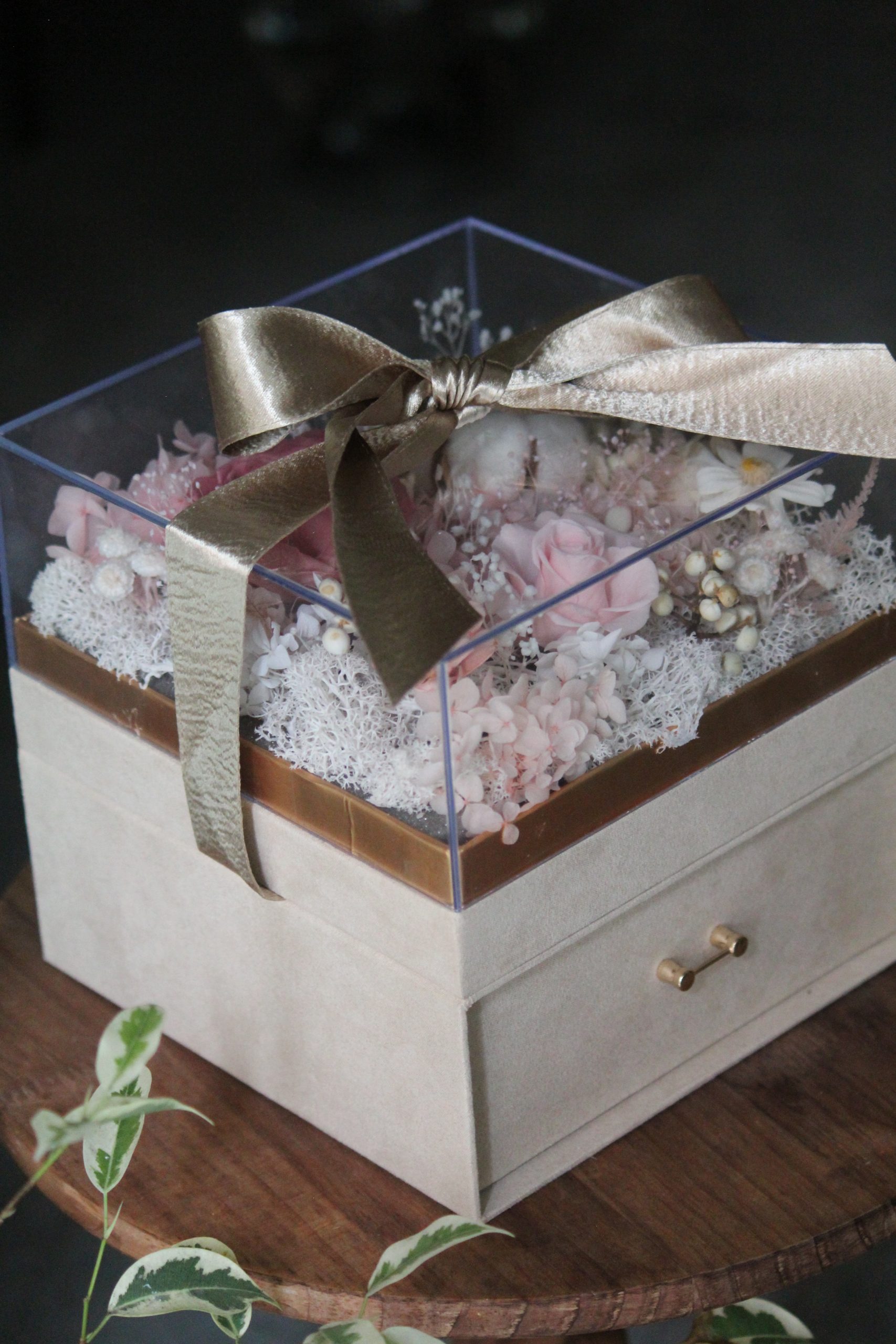 以淺粉色永生玫瑰花與葉材製作的永生花盒,搭配花店獨家手工製作的蠟燭-晨曦森林系列,營造浪漫的氛圍,再配上綠色系的花草點綴,整體感受非常浪漫又別緻,非常適合送禮。